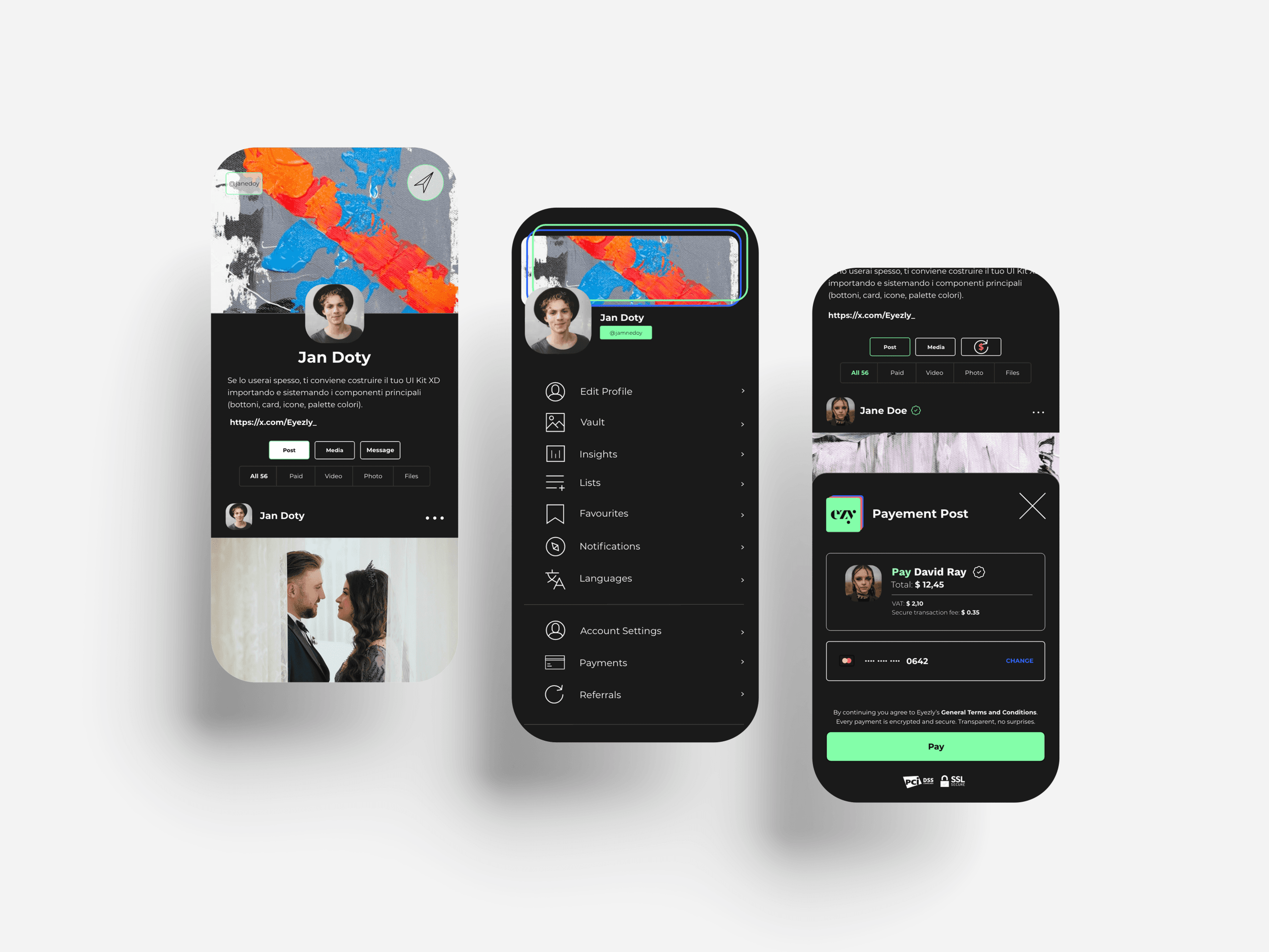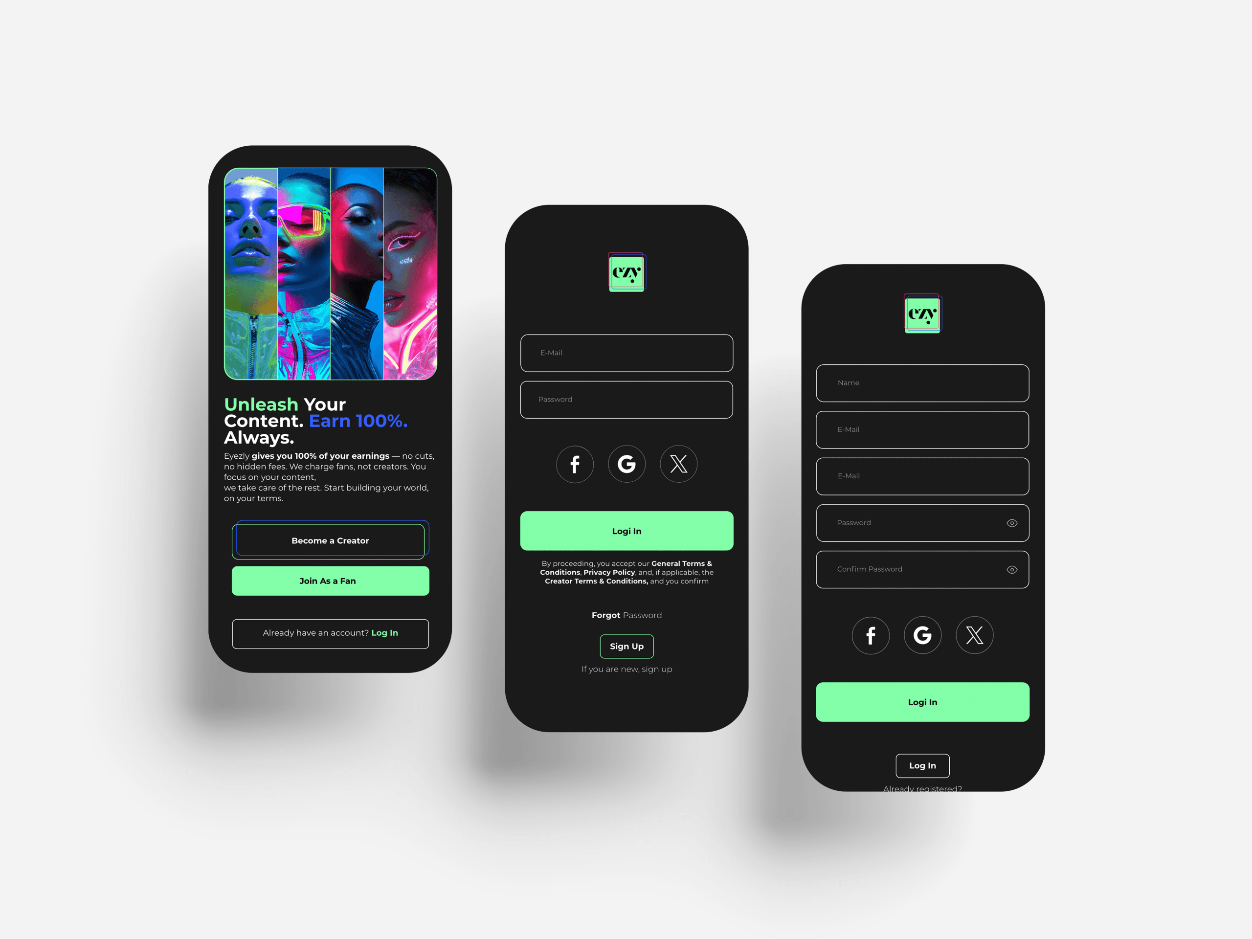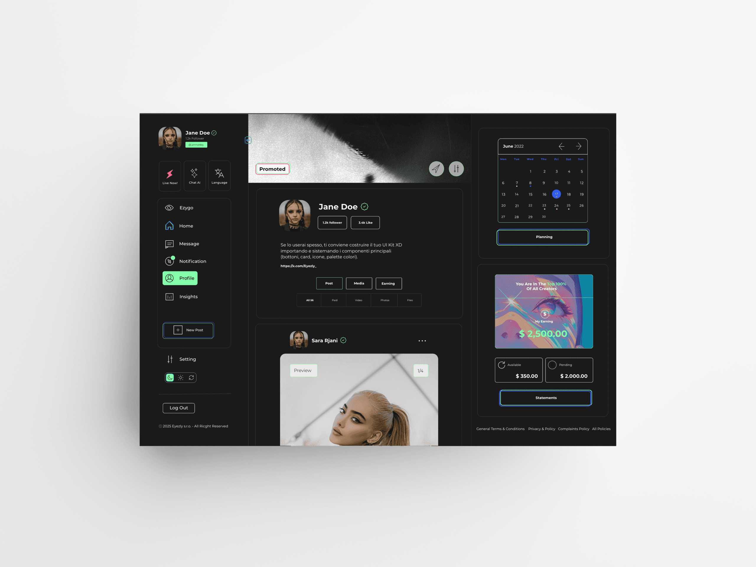 Grazie al nuovo design system e alla riorganizzazione dei flussi, l’esperienza utente è oggi più chiara, ordinata e coinvolgente. Il brand assume una personalità forte e immediatamente identificabile, posizionando Eyezly come ecosistema digitale d’avanguardia nel mondo dei creator.