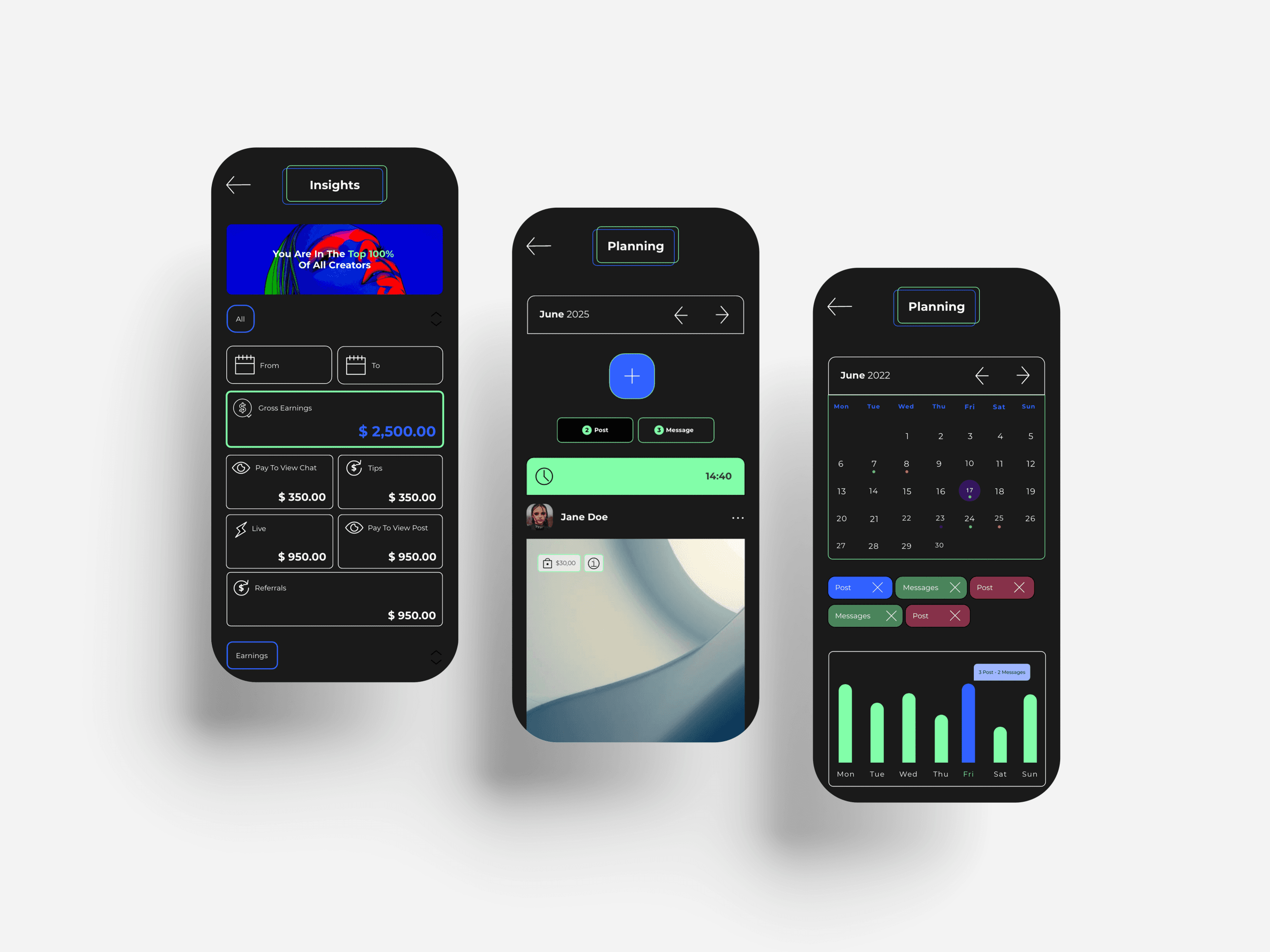 Il progetto richiedeva una coerenza visiva tra mobile e web, una riorganizzazione completa dei flussi di navigazione e un sistema UI scalabile per supportare funzionalità complesse come live streaming, chat, dashboard, guadagni e referrals.